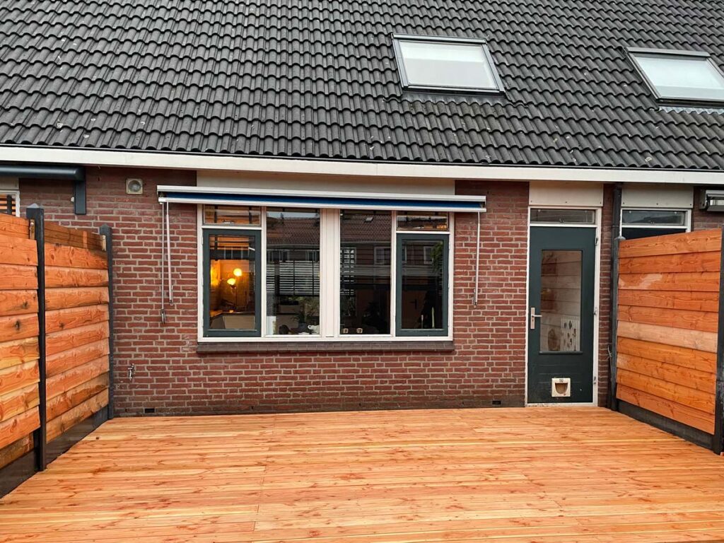 Voor deze tuin legden we een duurzame douglas vlonder, bevestigd met speciale vlonderschroeven voor een subtiele afwerking. Een stijlvolle én stevige toevoeging aan het buitenleven.