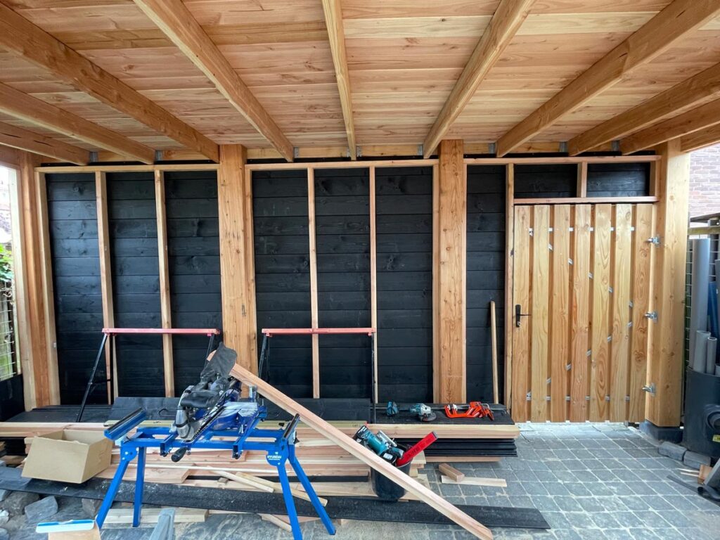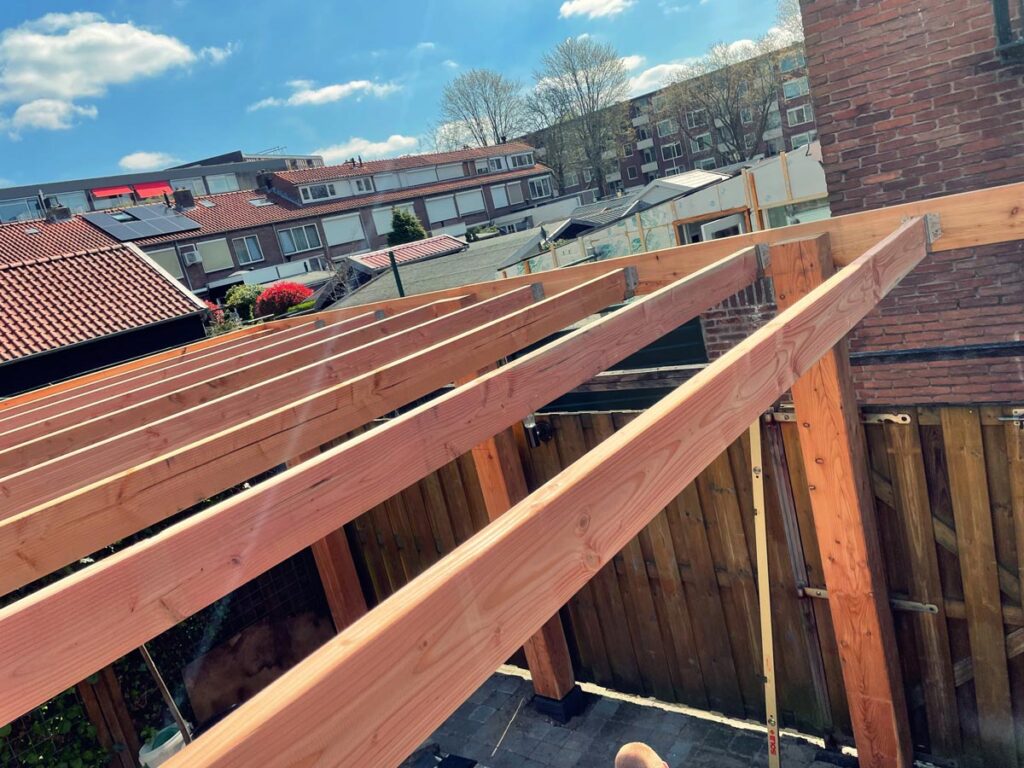 Na het nauwkeurig stellen van de poeren, de betonnen funderingspunten waarop de palen rusten, hebben we het frame opgebouwd. Vervolgens is het dak voorzien van houten schroten, wat direct zorgt voor een stevige basis. Om de overkapping volledig waterdicht te maken, is het dak afgewerkt met een EPDM-folie, die naadloos is verlijmd.