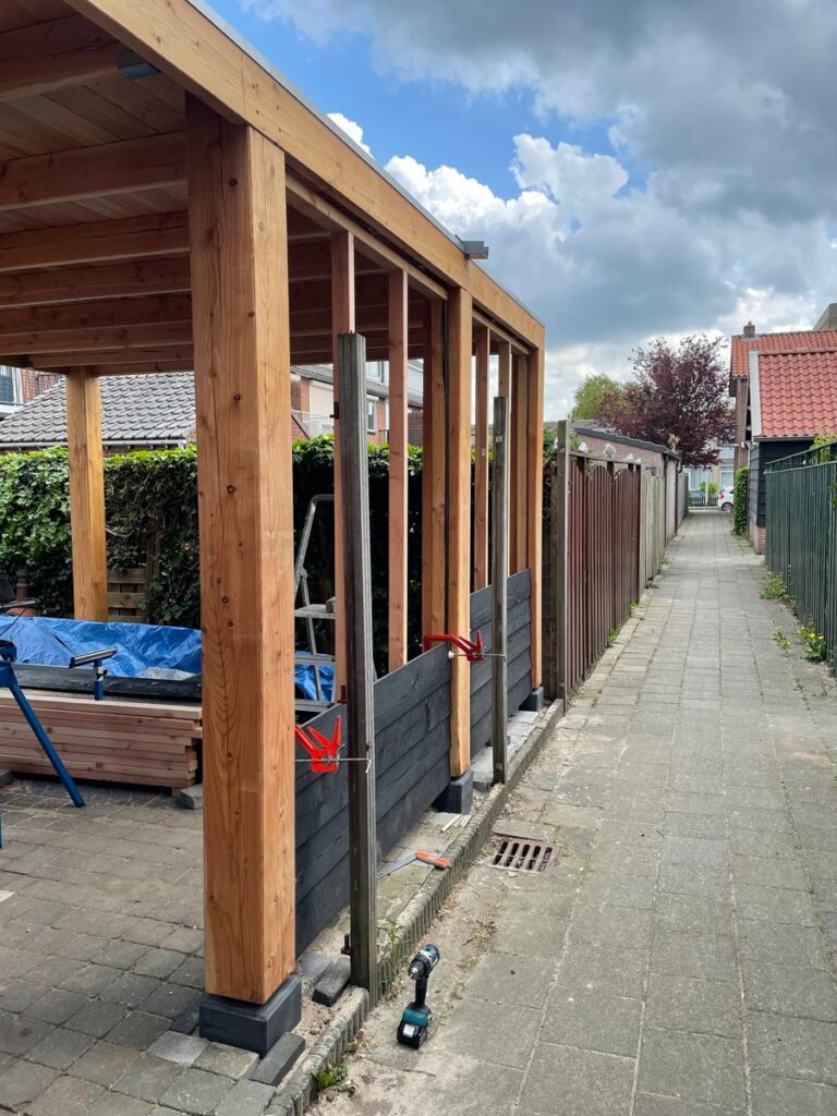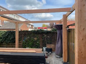 Voor dit project hebben we een robuuste en duurzame overkapping gerealiseerd, volledig opgebouwd uit douglas hout. Douglas is niet alleen sterk en weersbestendig, maar heeft ook een warme, natuurlijke uitstraling die perfect past bij een sfeervolle tuin.