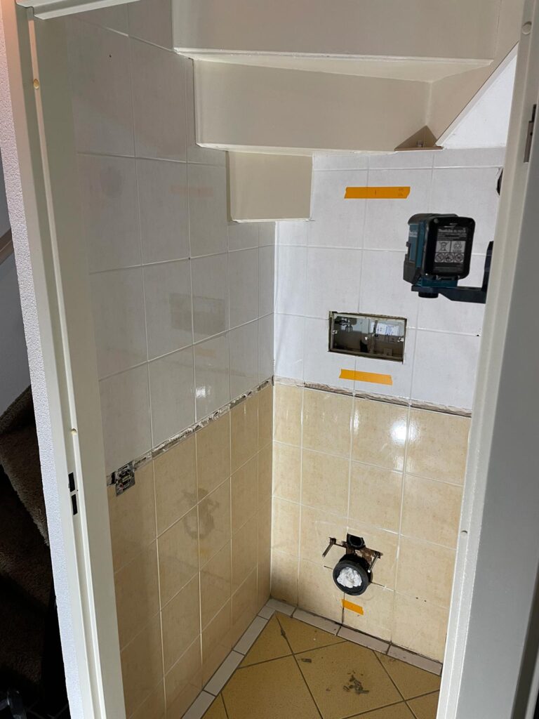 Bij deze klant was het toilet nog in originele staat, met verouderde tegels die qua kleur niet meer van deze tijd waren. In plaats van een volledige sloop- en tegelklus, is hier gekozen voor een slimme én stijlvolle oplossing: PVC-wandpanelen.