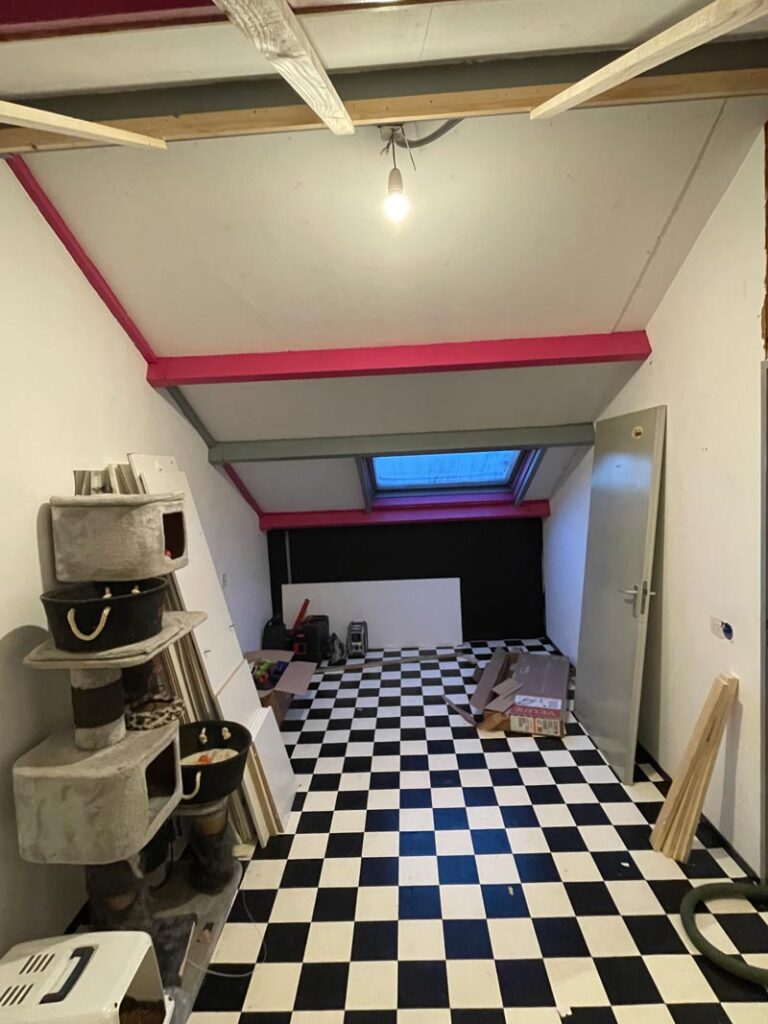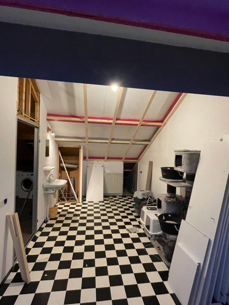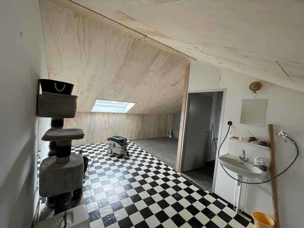 We zijn begonnen met het deels verwijderen van de bestaande scheidingsmuur. Enkele meters verderop plaatsten we een nieuwe wand, zodat de ruimte optimaal werd benut. Omdat de kapconstructie van de woning nog volledig ongeïsoleerd was, hebben we deze eerst uitgeraagd, goed geïsoleerd en daarna opnieuw bekleed.