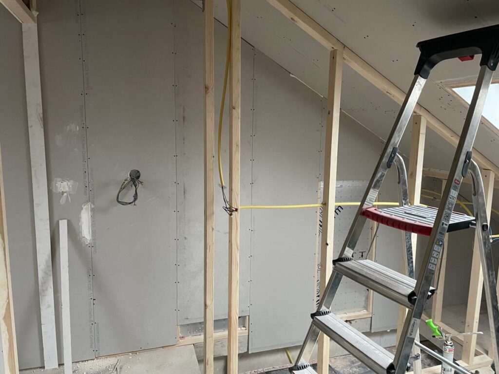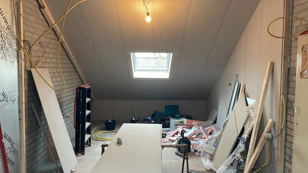 We begonnen met het plaatsen van twee dakramen om meer daglicht binnen te halen. Vervolgens is de kapconstructie volledig geïsoleerd, uitgeraggeld en strak afgewerkt met gipsplaten.