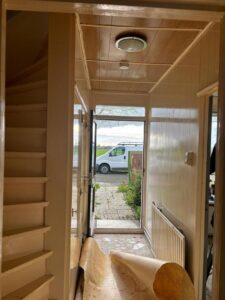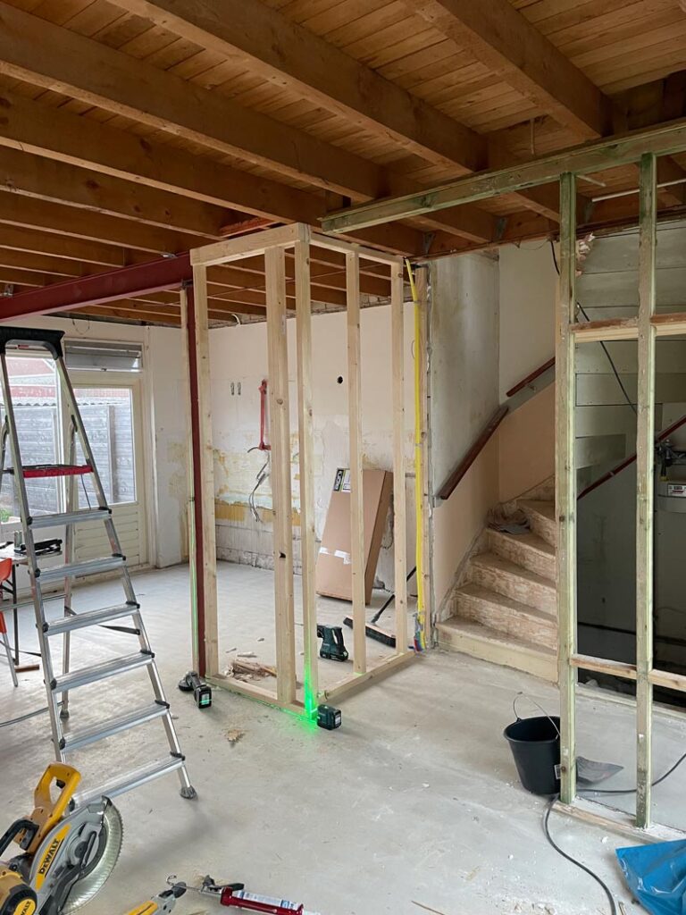 Bij deze woning mochten we écht vanaf de basis aan de slag. In de eerste weken hebben we de complete begane grond gestript: plafonds, wanden, elektra, leidingen én de houten vloer gingen eruit. De plafonds bestonden nog uit ouderwets board, en de vloer was opgebouwd uit houten balken — tijd voor een moderne upgrade.
