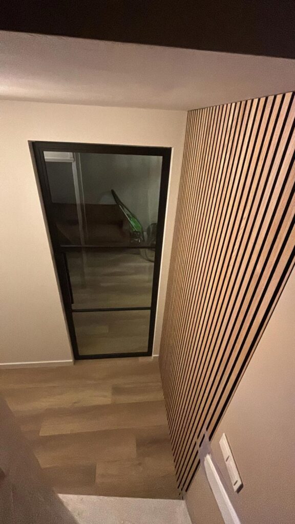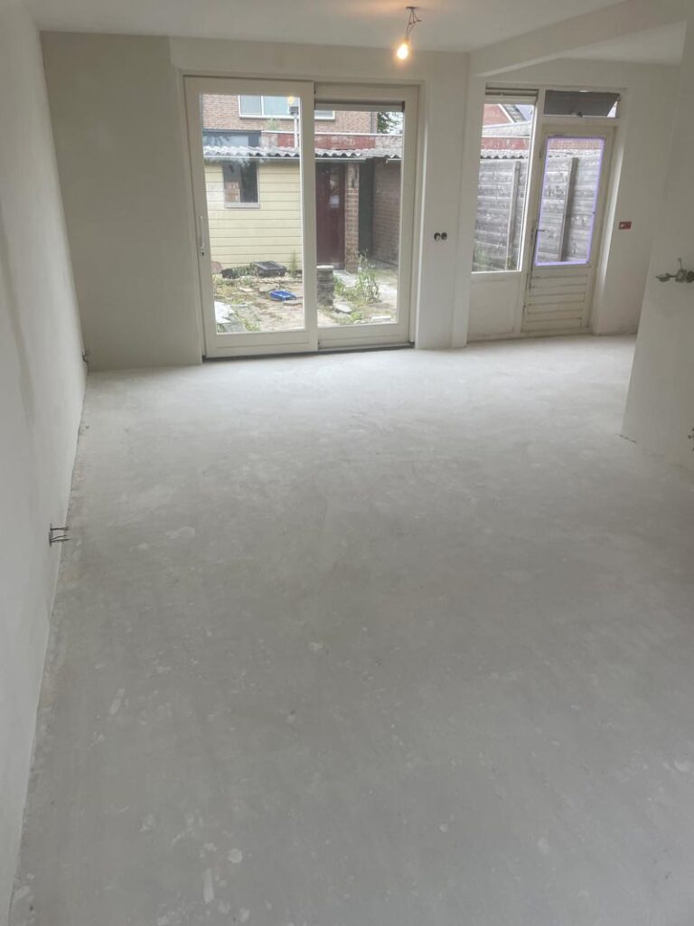 Ook de achterzijde van de woning kreeg een upgrade: de vaste ruit maakte plaats voor een schuifpui die zorgt voor meer licht en een directe verbinding met de tuin. Nadat onze stukadoor de wanden strak had afgewerkt, konden we de vloer en plinten plaatsen. Daarmee was dit intensieve maar mooie project afgerond.